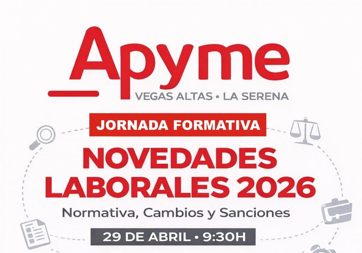 La asociación Apyme Vegas Altas La Serena organiza la jornada formativa 'Novedades Laborales 2026', sobre normativa, cambios y sanciones para orientar a sus asociados. Tendrá ... lugar el próximo miércoles, 29 de abril, a partir de las 9.30 horas, en las instalaciones del Vivero de Empresas de Don Benito, en la avenida de Badajoz.