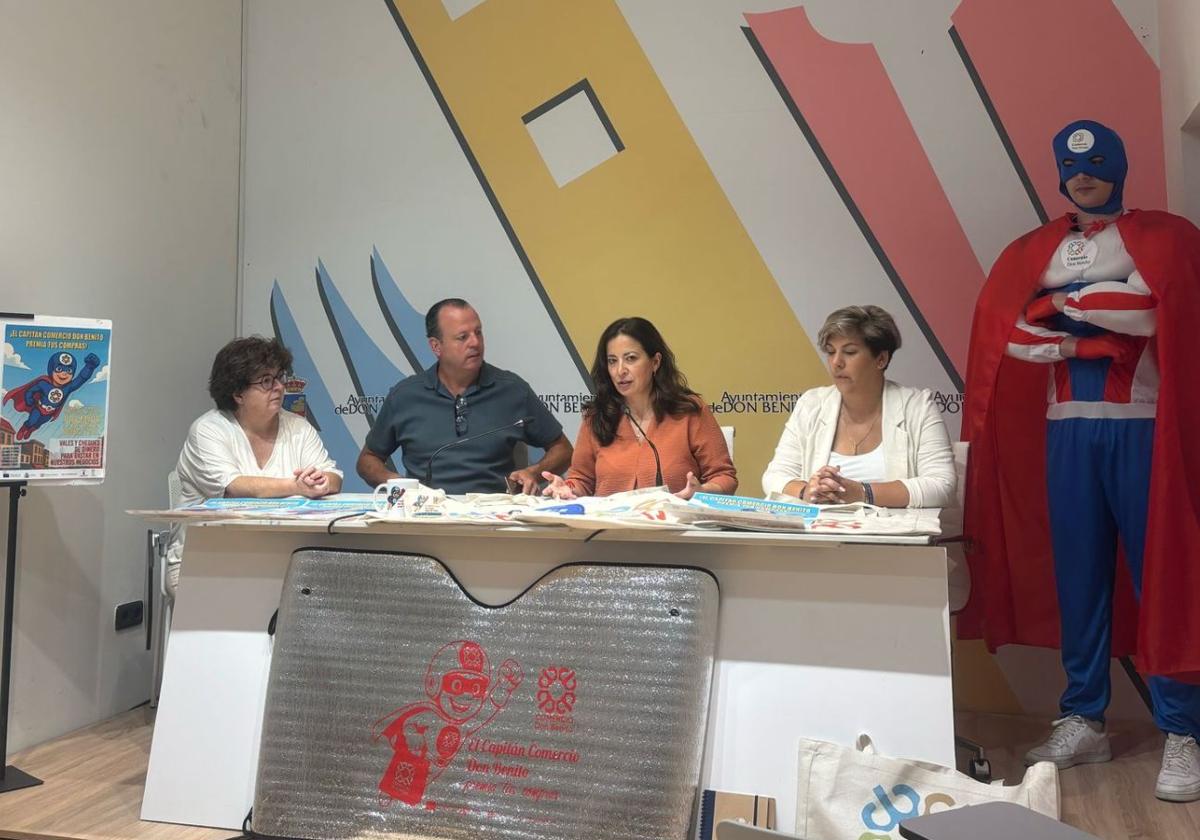 La asociación de Comercio de Don Benito presentó ayer una nueva acción para tratar de dinamizar las compras al comienzo de la época estival. Se trata del llamado Capitán Comercio, personaje ataviado como un superhéroe, que recorrerá las principales calles de la localidad y obsequiará a los compradores que se lo encuentren con regalos directos como bolsas de rafia, tazas, libretas o cheques de hasta 50 euros para gastar en un listado de más de 70 comercios de la zona que se han inscrito a la campaña.
