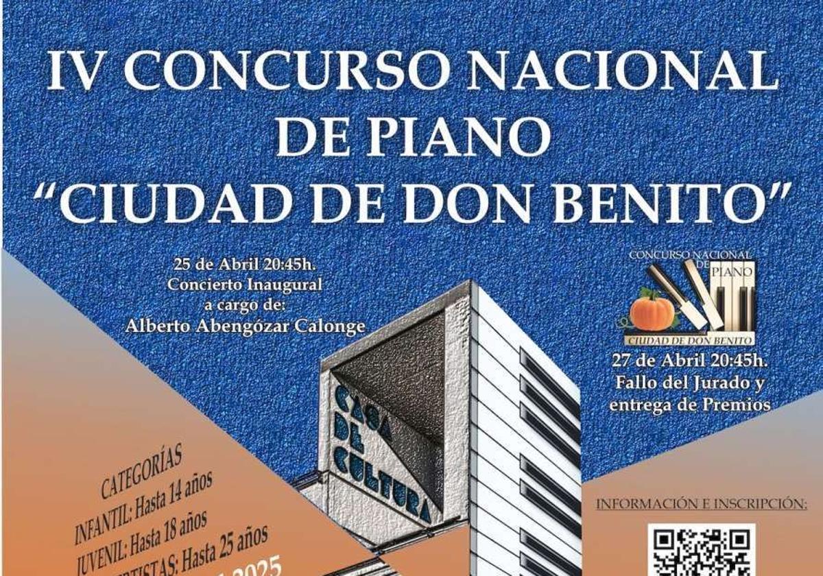 El IV Concurso Nacional de Piano 'Ciudad de Don Benito' se celebrará los días 25, 26 y 26 de abril. Se trata de un concurso con el que se busca estimular el desarrollo musical de pequeños y jóvenes pianistas. Podrán participar un total de 48 pianistas nacionales o extranjeros residentes en España (16 concursantes por categoría). Si se excediera en más de 16 inscripciones por categoría, el jurado llevará a cabo una prueba de preselección.
