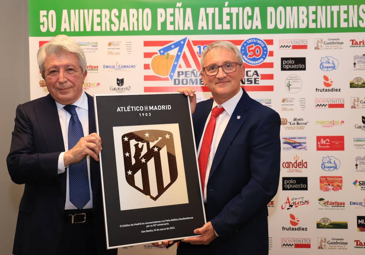 Decenas de aficionados del Atlético de Madrid se dieron cita este viernes en la celebración del 50 aniversario de la Peña Atlética Dombenitense celebrado con la ilustre presencia del presidente rojiblanco, Enrique Cerezo, que no quiso perderse el homenaje. Acompañado por el presidente de la peña, Manuel Banda, Cerezo fue recibido por el alcalde, José Luis Quintana, en el museo etnográfico de la localidad dombenitense. Allí firmó en el Libro de Oro de la ciudad antes de encontrarse con los aficionados colchoneros en el hotel Vegas Altas.