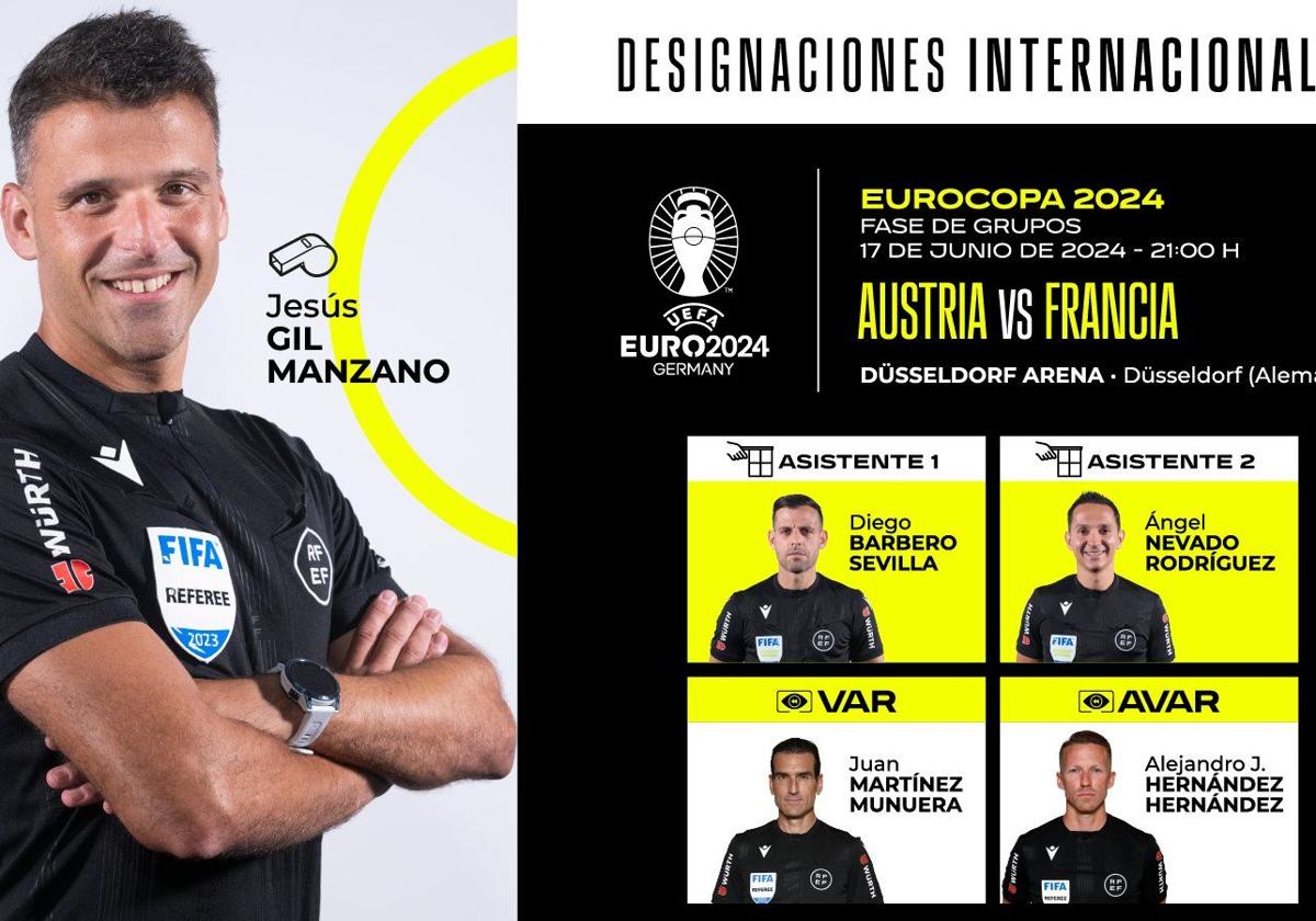Jesús Gil Manzano, el colegiado español designado por la UEFA para dirigir encuentros en la Eurocopa 2024, debutará en el torneo este lunes en el encuentro del Grupo D que enfrentará a Austria y Francia en Dusseldorf (21.00 horas). Estará auxiliado en las bandas por Diego Barbero y Ángel Nevado, mientras que Alejandro Hernández Hernández y Juan Martínez Munuera en el VAR.