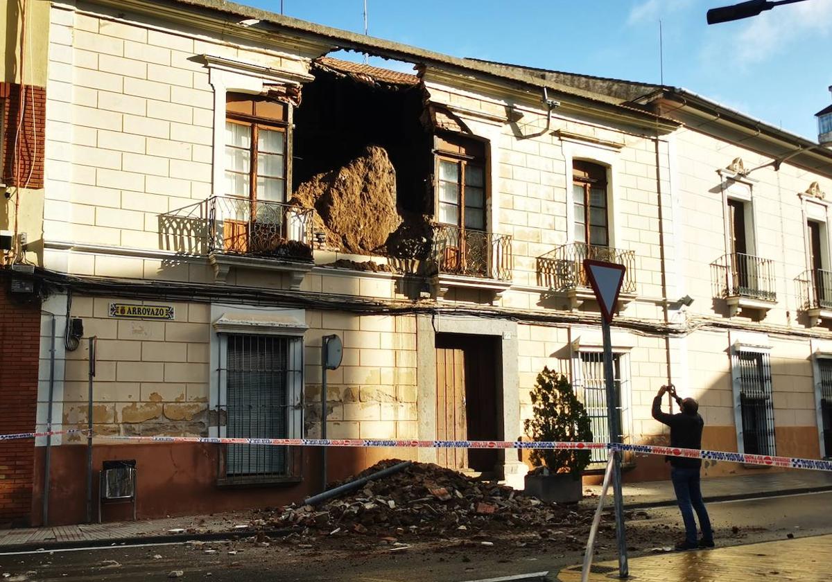 Parte de una vivienda deshabitada, ubicada en la calle Arroyazo de Don Benito, se ha derrumbado esta mañana causando únicamente daños materiales. Ha ocurrido en torno a las 8.30 de la mañana y, según explican algunos vecinos, todo ha quedado en un susto debido a las vacaciones por carnaval de los centros educativos. No obstante, es un lugar de paso a esa hora para cientos de escolares que acuden al colegio Claret.