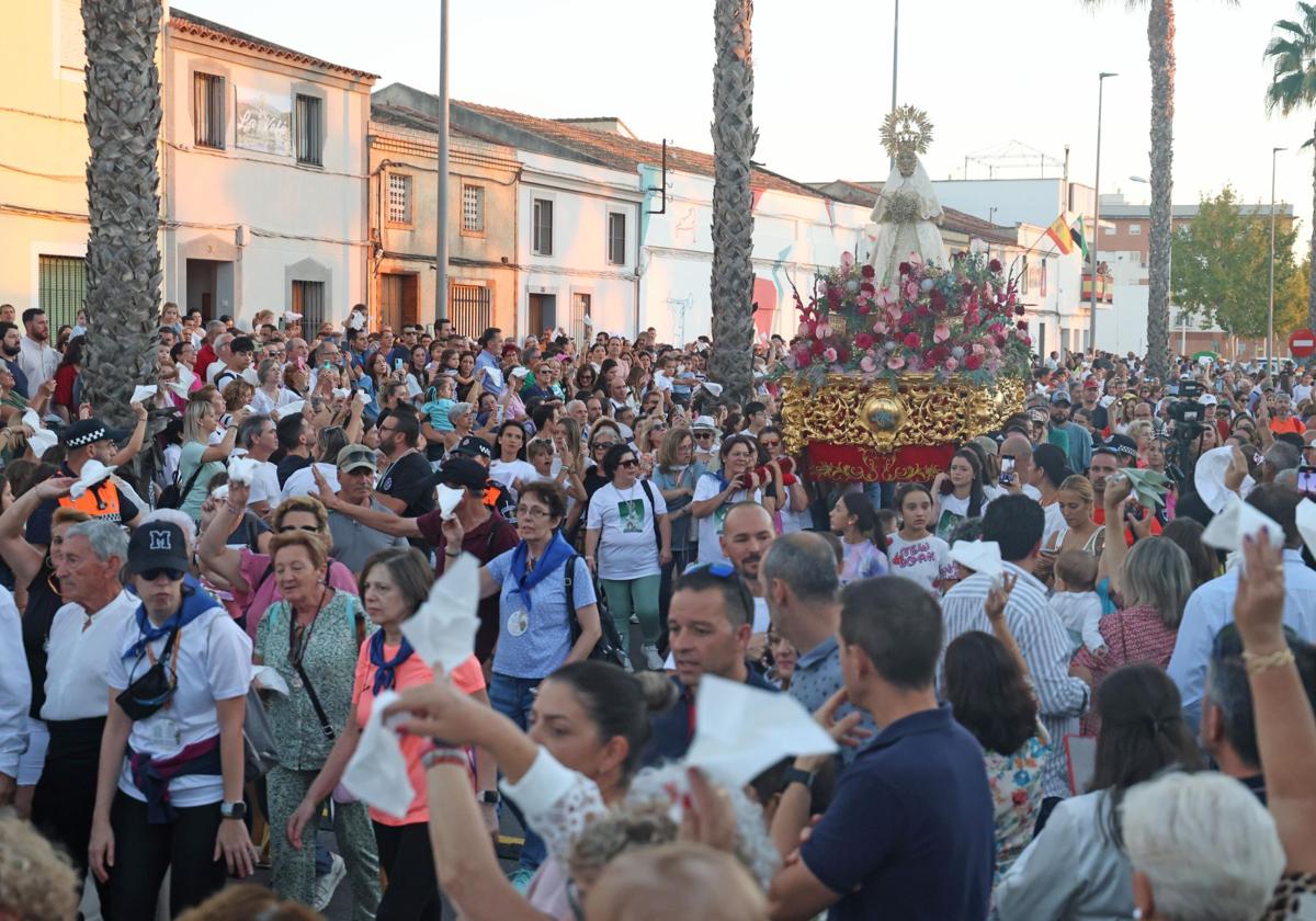 Don Benito volvió a cantar este domingo aquello de «Bienvenida, pasa adelante, esta es tu casa, este es tu hogar». Lo hizo, como es tradición, en el recibimiento a la Virgen de las Cruces que llegó desde su ermita para pasar algo más de 10 días en la localidad, con motivo de las fiestas de 'La Velá. Tradición y Gastronomía'.