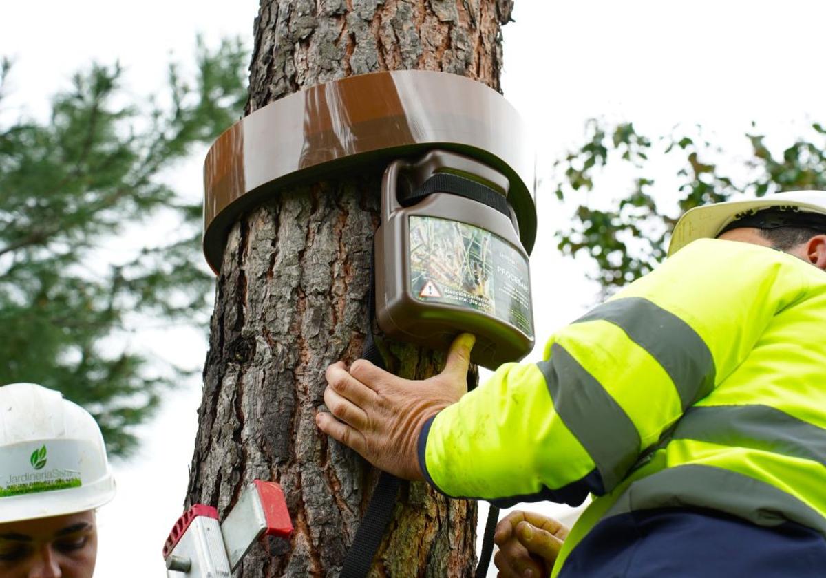 Los elementos instalados rodean el tronco del árbol y capturan a las orugas antes de que desciendan al suelo para completar su ciclo de vida, minimizando así los riesgos.