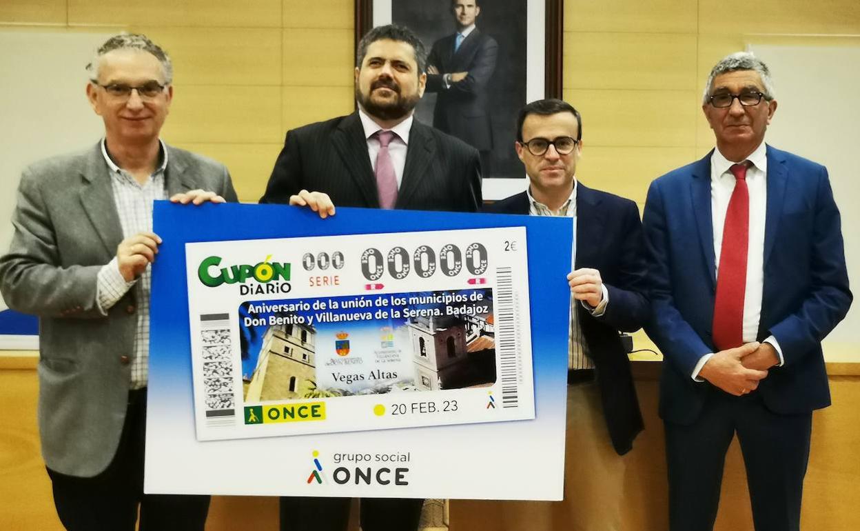 En este acto, Fernando Iglesias, Delegado Territorial de la ONCE en Extremadura, ha entregado la imagen del cupón a los alcaldes de Don Benito y Villanueva, José Luis Quintana y Miguel Ángel Gallardo.