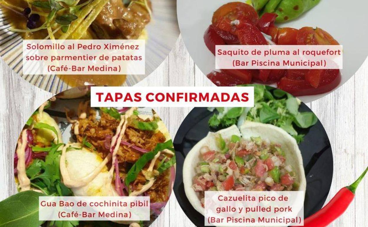 Las recetas de Medina Café Bar Restaurante serán solomillo al Pedro Ximénez sobre parmentier de patatas y gua bao de cochinita pibil'. Mientras que el bar Piscina Municipal elaborará un saquito de pluma al roquefort y una cazuelita de pico de gallo y pulled pork. El precio de cada tapa será de 2 euros.