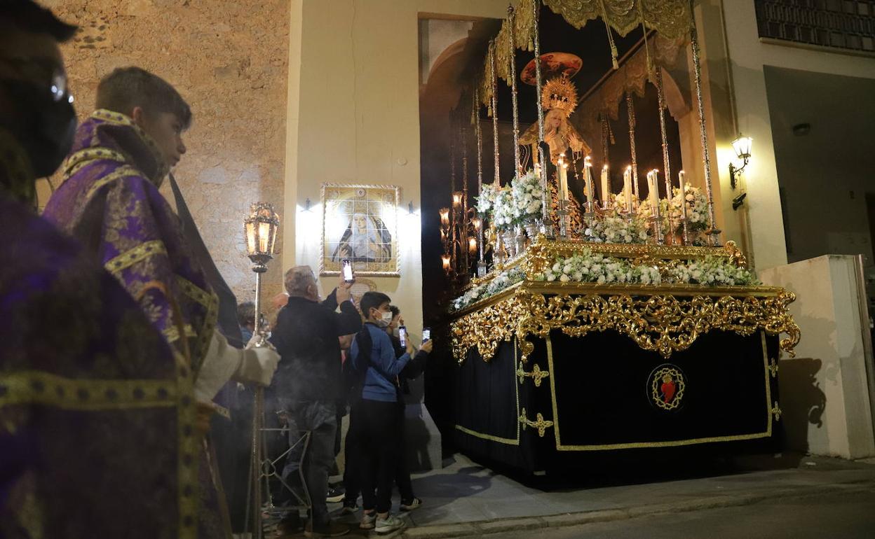 Hora y media después, desde la parroquia de Santa María, el paso de la Virgen de La Soledad se subía a hombros de 32 portadores guiados por Antonio Miguel Fernández como capataz. Pero antes de abrirse las puertas, entonaban su himno que se podía escuchar desde la calle: «Acompañas a cristo que sufre, pero luego qué sola que estás. Una cruz ya sin Cristo es tu sombra, te has quedado con tu soledad. Virgen de la Soledad, quiero hacerte compañía».